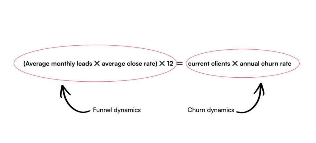 You can easily find your churn tipping point using our growth calculator. Input your funnel factors and number of current clients, then adjust churn until you get the warning message.
