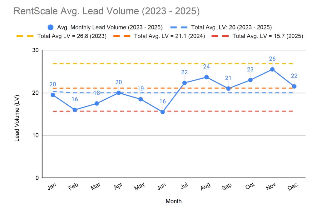 In his post, Peter cites RentScale’s Scoreboard, which tracks lead volume and doors added as reported by their customers (they run the largest property management sales community in the country). They looked at average lead volume from 2023-2025 and confirmed what many property managers have suspected.