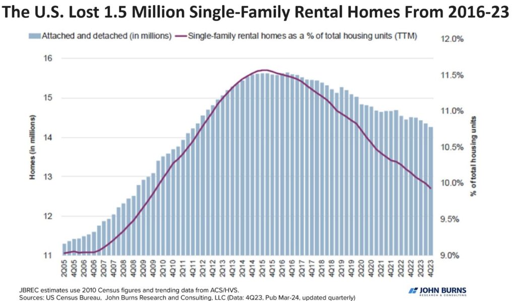 At the one hour mark, he makes a guess that I think is as good as any. He cites recent reporting that shows over 1.5 million single-family homes left the rental market between 2016 and 2023. Combine that with the nation’s inventory crisis and the current market conditions that are converting lots of SFRs to owner-occupied, and there are just way fewer rentals on the market than in 2023 and earlier.
